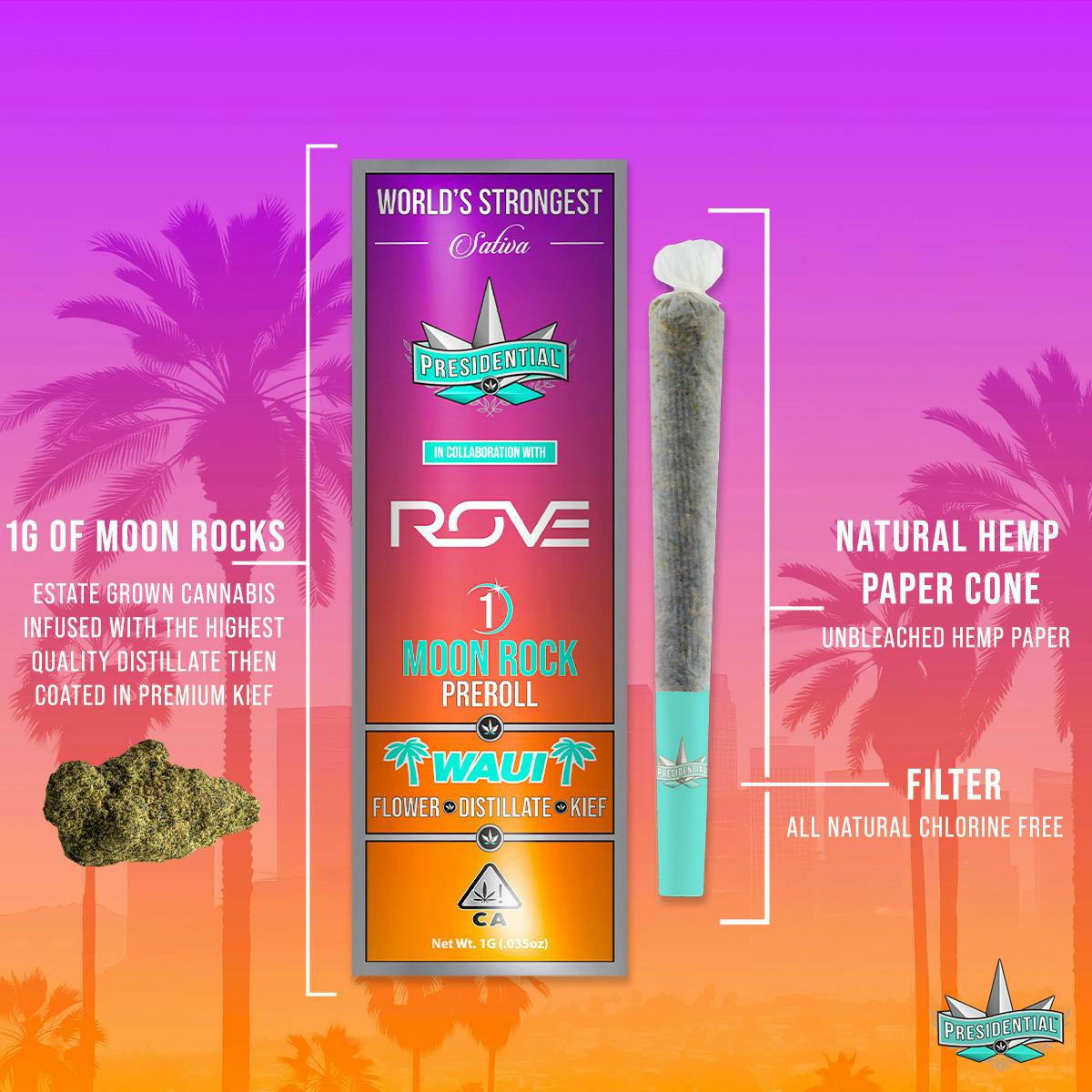Your Presidential Moon Rock Preroll consist of estate grown, single sourced flower. The flower is then INFUSED with premium distillate formulated by award winning manufacturer Rove, using Presidential’s proprietary infusion process that enables us to permeate the flower to the stem. Finally, it is coated in the highest quality kief, creating the slowest burning, most potent Moon Rocks on the market! Our Prerolls are ground and rolled in organic hemp cones for your enjoyment! Waui is a vacation in every puff!