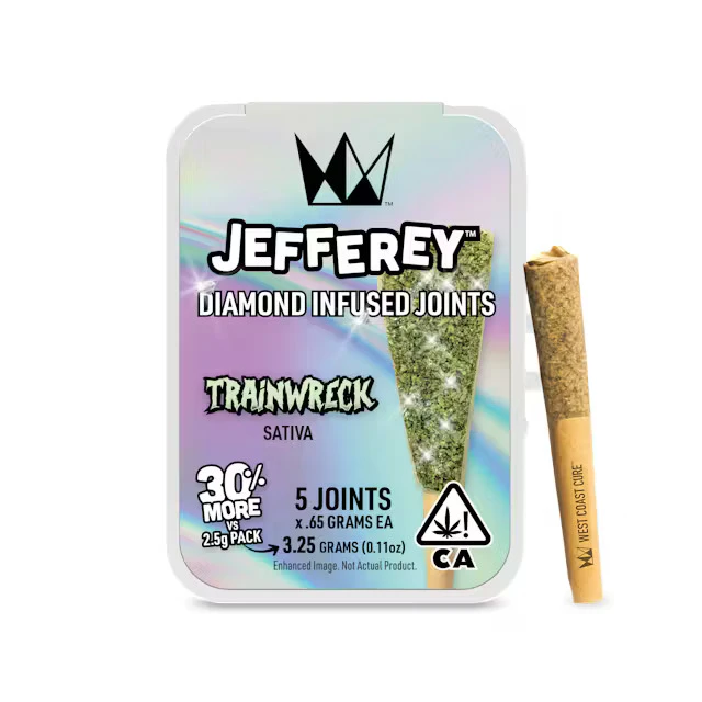 Buckle up and brace for impact, this legendary strain is back at the station. The Trainwreck Jefferey 5-Pack delivers a fast-hitting collision of sativa power and citrus. Honoring its roots, this Jefferey brings classic sharp pine and lemon terps, dialed up to eleven with THC diamonds. Whether you're fueling a wild night out or sparking up to get creatively derailed, this 5-pack is your first-class ticket to an unforgettable ride.