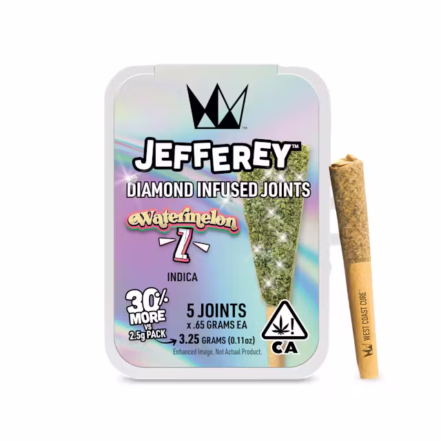 Indulge in the delightful fusion of aromas and zest with WCC's Watermelon Z Jefferey 5-pack. Crafted from whole nug buds, these .65g mini joints boast an enticing bouquet with rich tropical notes. Infused with potent THCa diamonds and enriched with kief from our Top Shelf Flower, each mini joint creates a relaxed vibe-shift. Subtle. Satisfying. Harmonious. Perfect for those looking to unwind and enjoy a premium smoking experience.
